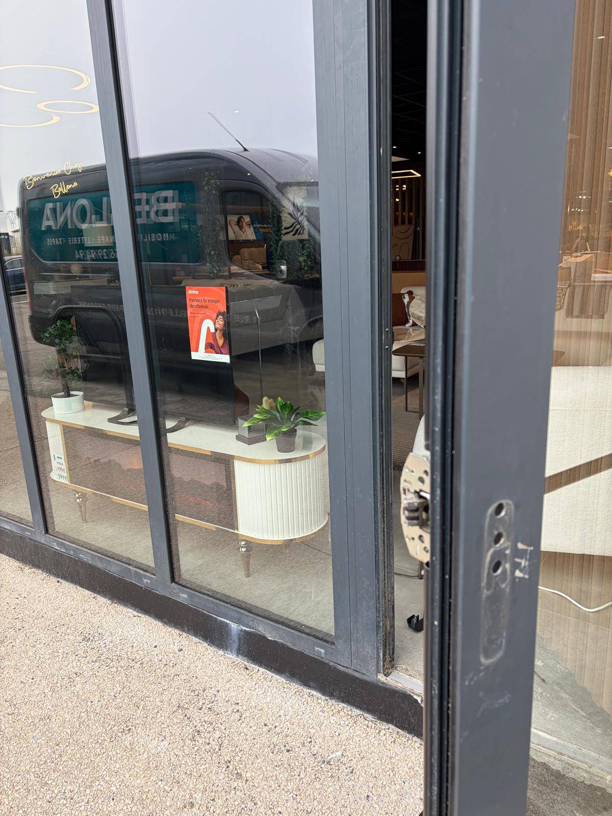 Le magasin Bellona de Portet-sur-Garonne m'a contacté après une effraction sur sa porte vitrée en aluminium. La serrure multipoints avait été forcée, la platine arrachée, le mécanisme complètement exposé. Plus rien ne retenait la porte. J'ai sécurisé le local dès mon arrivée.